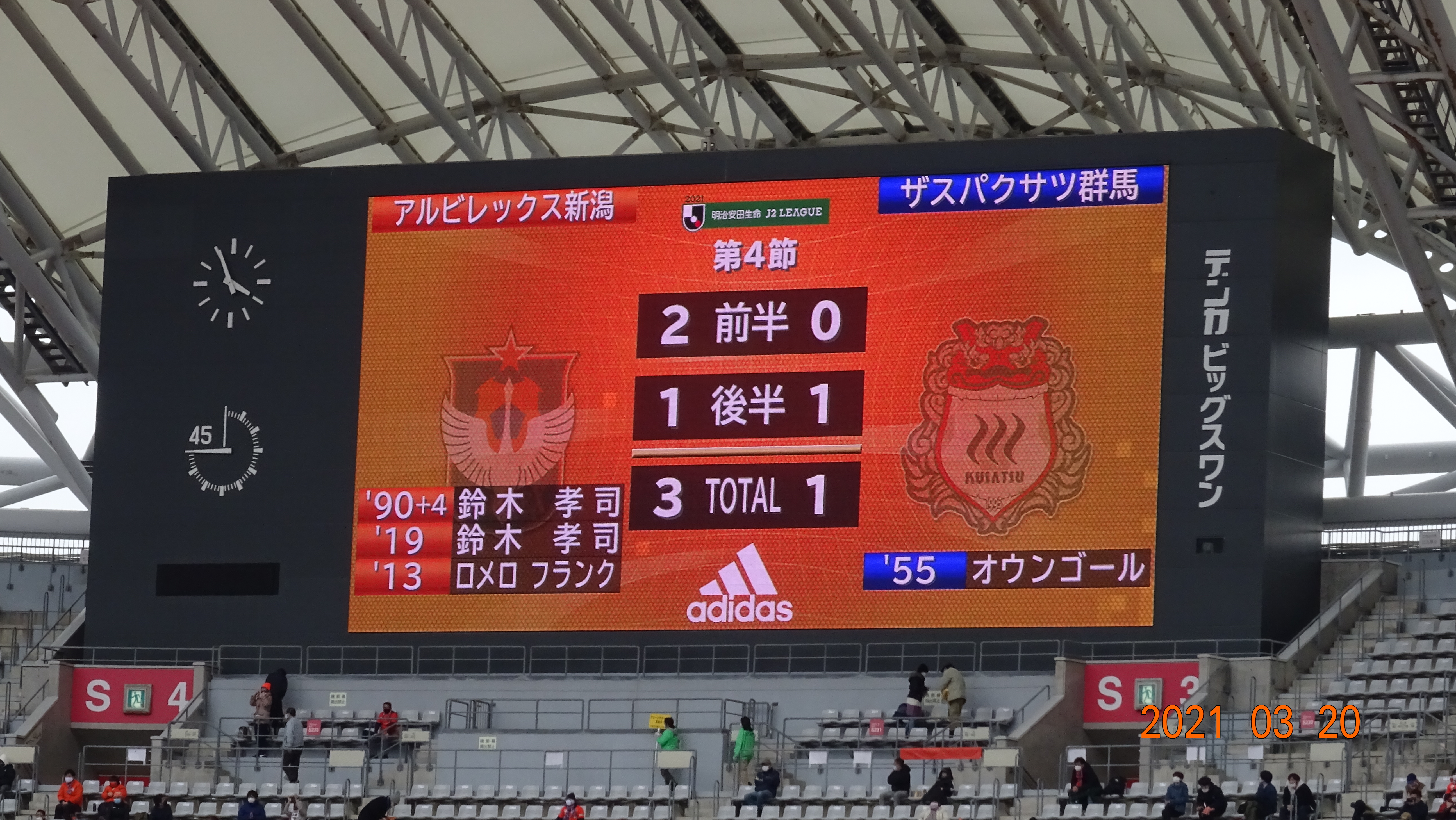 20日J2リーグ21第4節が行われ、アルビレックス新潟はホームデンカビックスワンでザスパクサツ群馬と対戦し、3対1でアルビレックス新潟がMFロメロフランク、FW鈴木孝司の2ゴールで勝利し、22年ぶりの開幕4連勝で4勝0敗0分勝ち点12得失点差+7で首位をキープした。