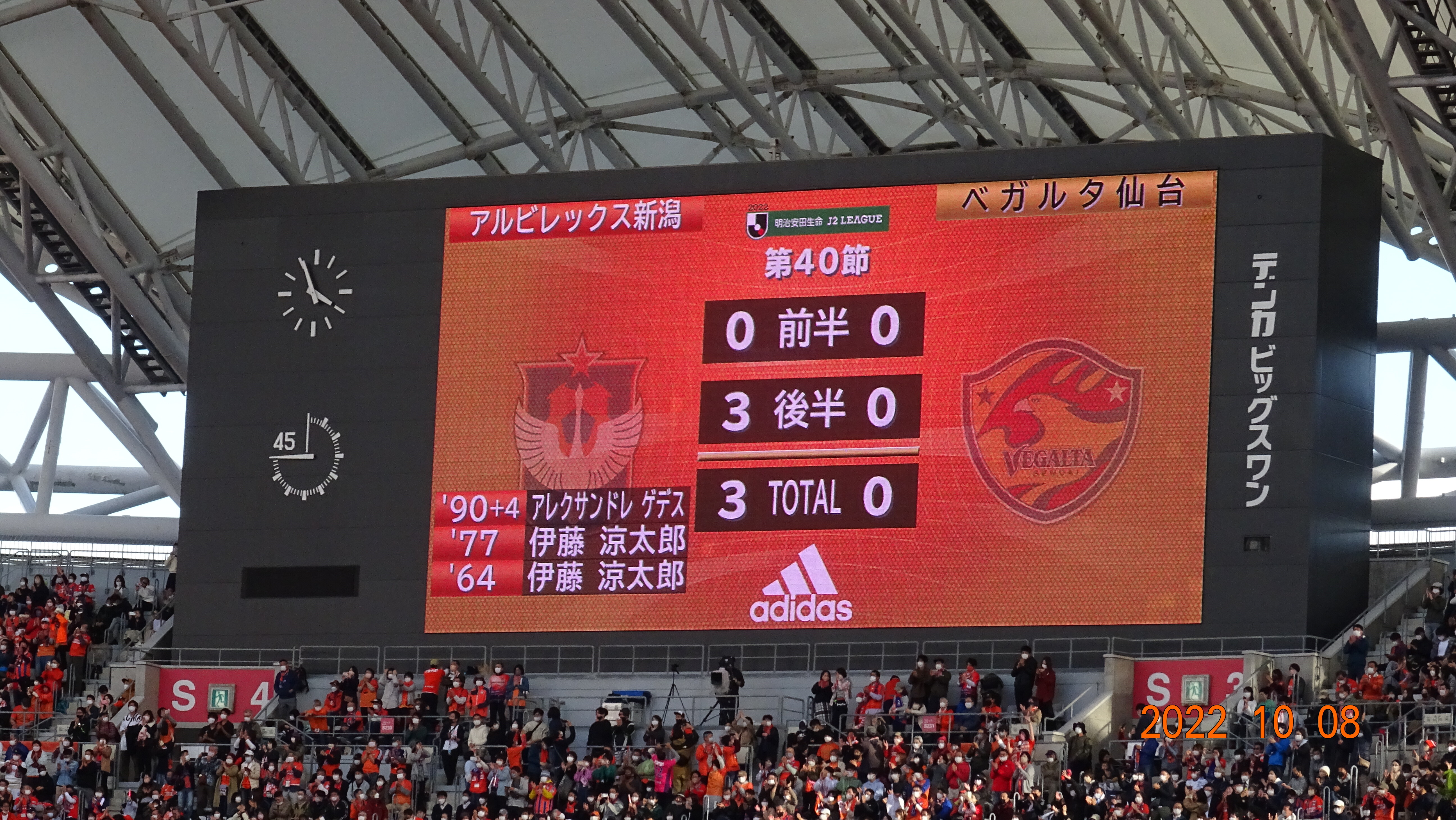 8日J2リーグ22第40節が行われ、アルビレックス新潟はホームデンカビックスワンでベガルタ仙台と対戦し、3対0で新潟が圧倒的なパスサッカーで仙台を終始翻弄し続けてMF伊藤涼太郎の2ゴールに最後はFWアレクサンドレゲデスのゴールで圧勝し、24勝9分7敗勝ち点81得失点差+39で首位をキープし2試合を残してJ1昇格を決めた。